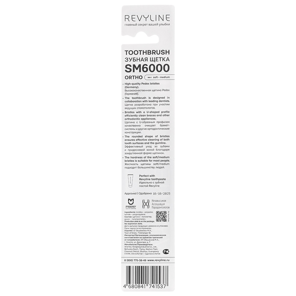 Зубная щетка Revyline SM6000 Ortho обеспечивает бережный уход за полостью рта с установленными несъемными брекет-системами или другими ортодонтическими конструкциями. Щетина с V-образным профилем позволяет качественно очищать от микрочастиц пищи и бактериального налета детали и узлы брекет-систем.